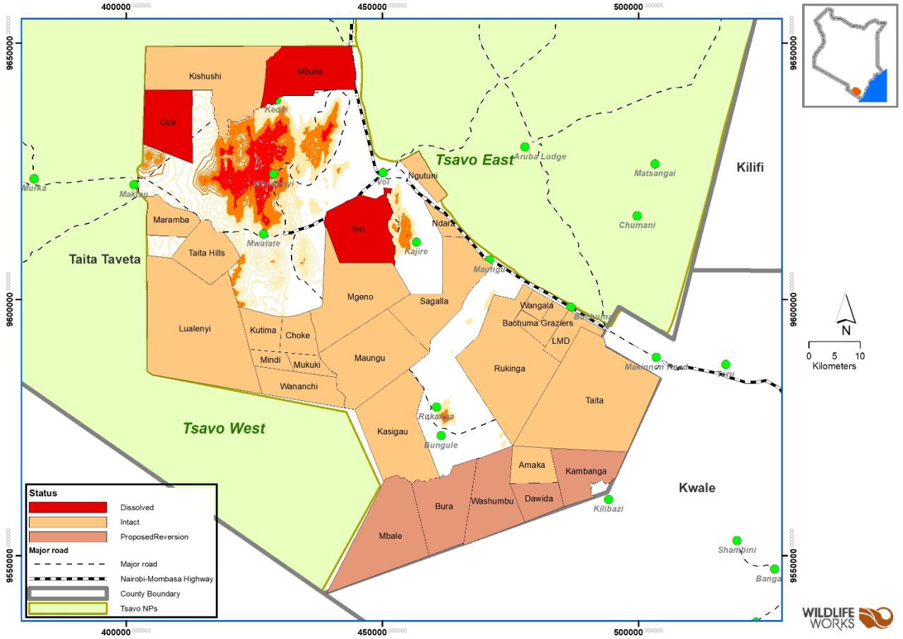 The current debates by members of the County Assembly Taita Taveta (MCA’s) could jeopardize conservation gains in the Tsavo Conservation Area. The land lease agreement between the Government and the current owners of Mkuki Ranch expired in December 2019. And there seems to be a looming conflict on who should own the land. MCA’s are scheming to have ownership of this ranche revert from present owners to the chawia community. Politicians have already incited the communities to invade the ranche and there is massive logging taking place. This has sparked a campaign across the County to have ownership of selected ranches revert to the taita community. If these are allowed ownership of these ranches will revert to the local community, and end up being subdivided to individuals affecting the wildlife connectivity in the Tsavo conservation areas. Three ranches highlighted in red (map above) have been dissolved and another five – Mbale, Bura, Washumbu, Dawida and Kambanga are targeted.CAK through the Kenya Elephant Forum (KEF) and in collaboration with Taita Ecosystem Dispersal Area (TEDA) a multi sectoral initiative lead by the PS Ministry of Agriculture, Taita Taveta Wildlife Conservancy Association (TTWCA), Africa Wildlife Foundation, The Nature Conservancy (TNC) and SOKNOT an initiative by WWF Kenya have come together to forge a partnership with common approach on implementation of the wildlife corridors and dispersal areas report. in the Tsavo-Mkomazo Conservation Area.